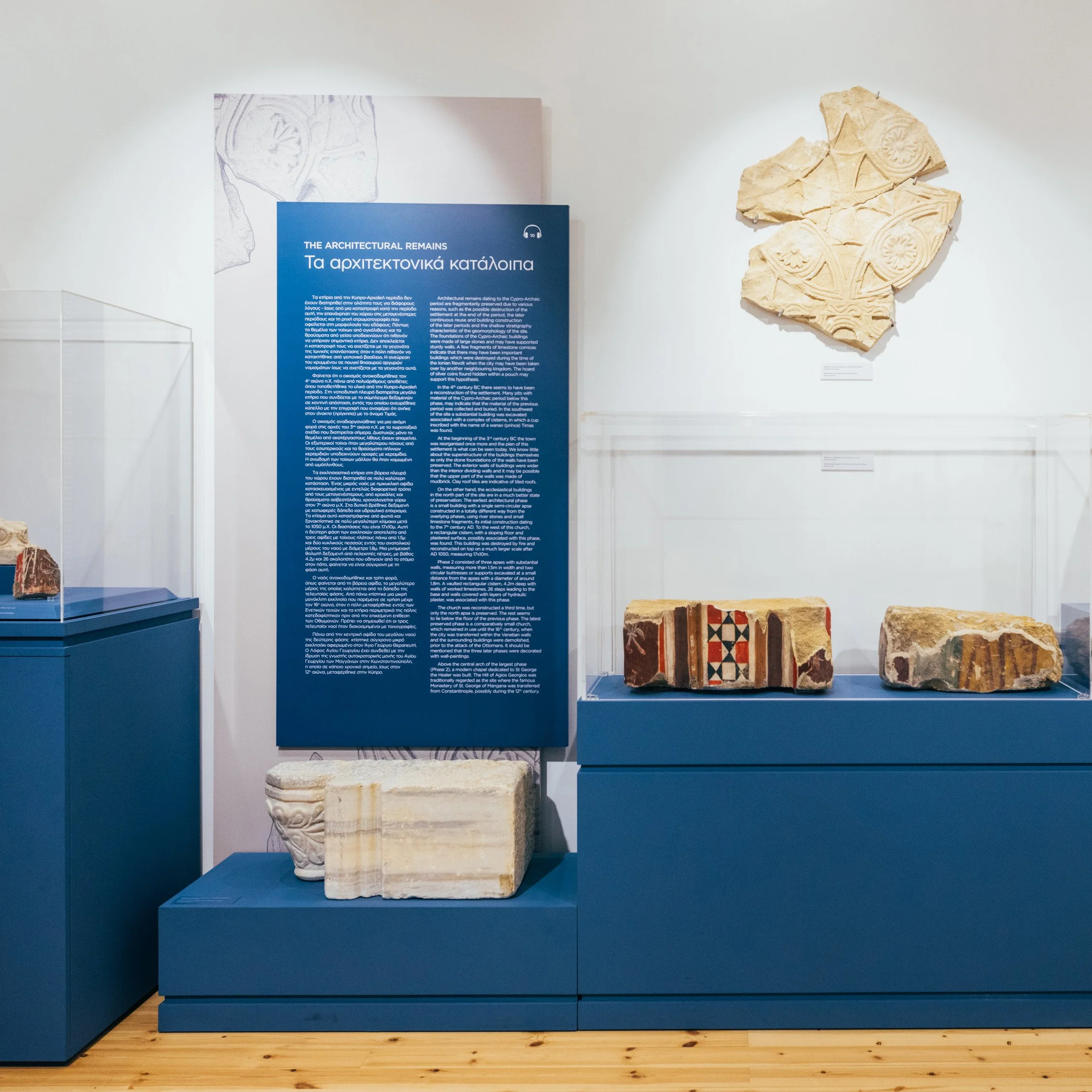 “Our wall panels were created to bring history to life with an earthy yet rich colour palette that best reflects the character of Cyprus and captivates the viewer’s gaze, connecting the modern-day visitor with ancient exhibits.”