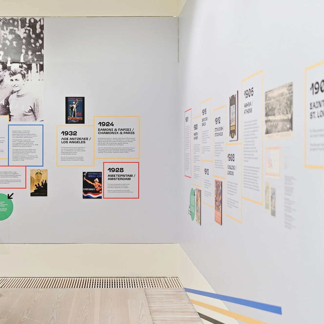 This is where the appios® team was appointed to design the exhibition identity. Influenced by the Olympic Rings, the colour scheme, red, yellow, blue, green and black was used throughout the entire exhibition, giving the facts and dates a playful and spirited feel. Further accommodating design process led to the development of wall displays/graphics/murals/information panels/timeline panels and a leaflet which featured the timeline of all recorded Olympic Games.